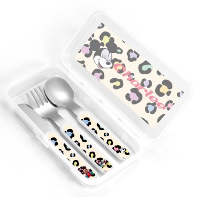 Let your little one dine in style with our customizable kids’ cutlery set, designed with Disney-traveling families in mind! This adorable, safe, and practical 3-piece set includes a fork, spoon, and knife, all with personalized white handles made of non-toxic PP plastic and high-quality stainless steel.